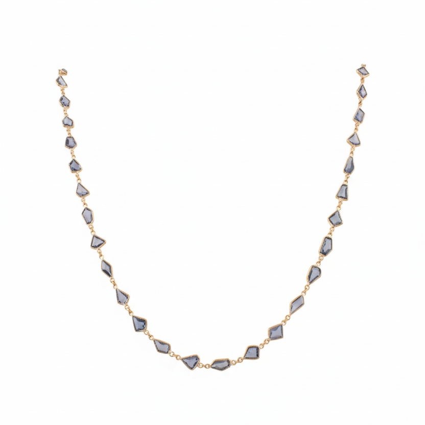 This elegant 18K yellow gold Blue Sapphire necklace from Tresor’s Fin Collection showcases natural sapphires in a distinctive organic freeform cut, offering a modern yet refined aesthetic. With a total gemstone weight of 11.86 carats, the design flows beautifully, adding depth and sophistication to everyday and occasion wear.
