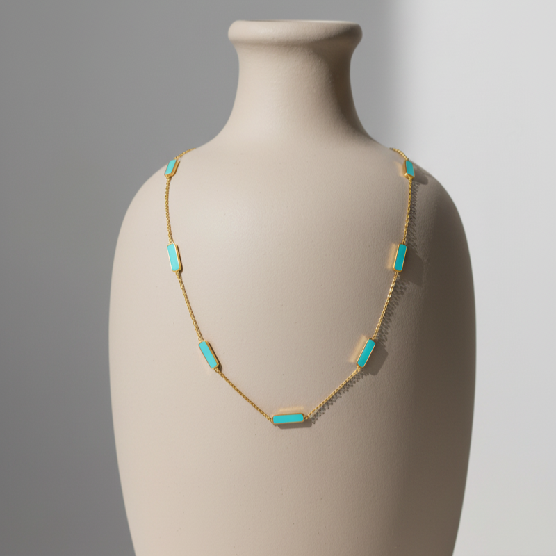 Necklace with turquoise rectangular stones on a gold chain against a white background 18K gold turquoise necklace flatlay – luxury fine jewelry by Tresor Collection