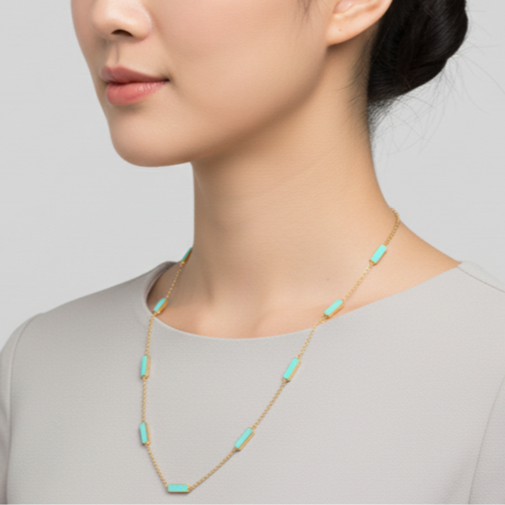 Woman wearing a necklace against a plain background Turquoise necklace styled for festive occasions – modern luxury jewelry by Tresor Collection