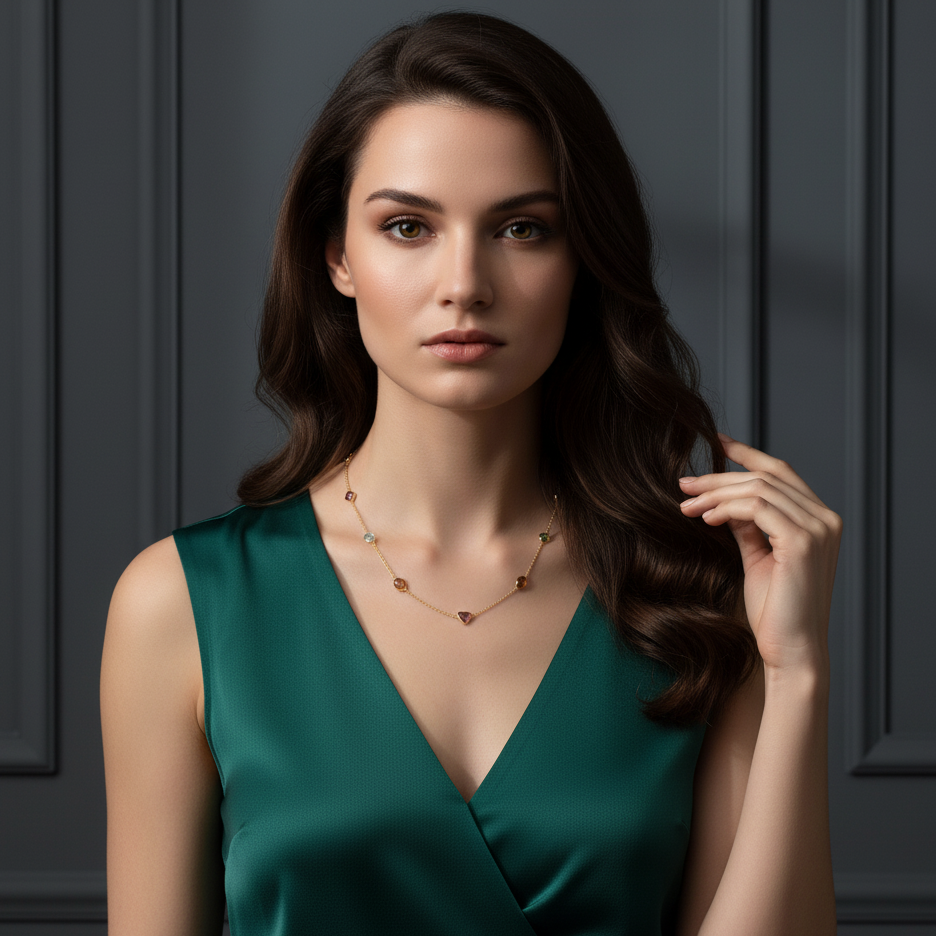Woman wearing a gold necklace with green background Elegant multicolor gemstone gold necklace on model – designer fine jewelry by Tresor Collection