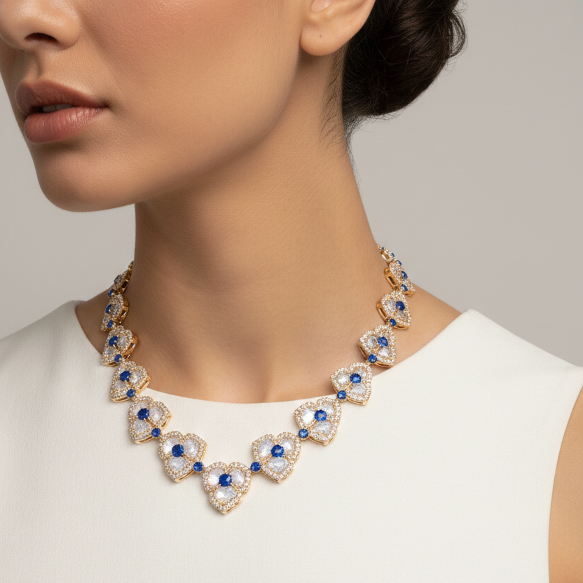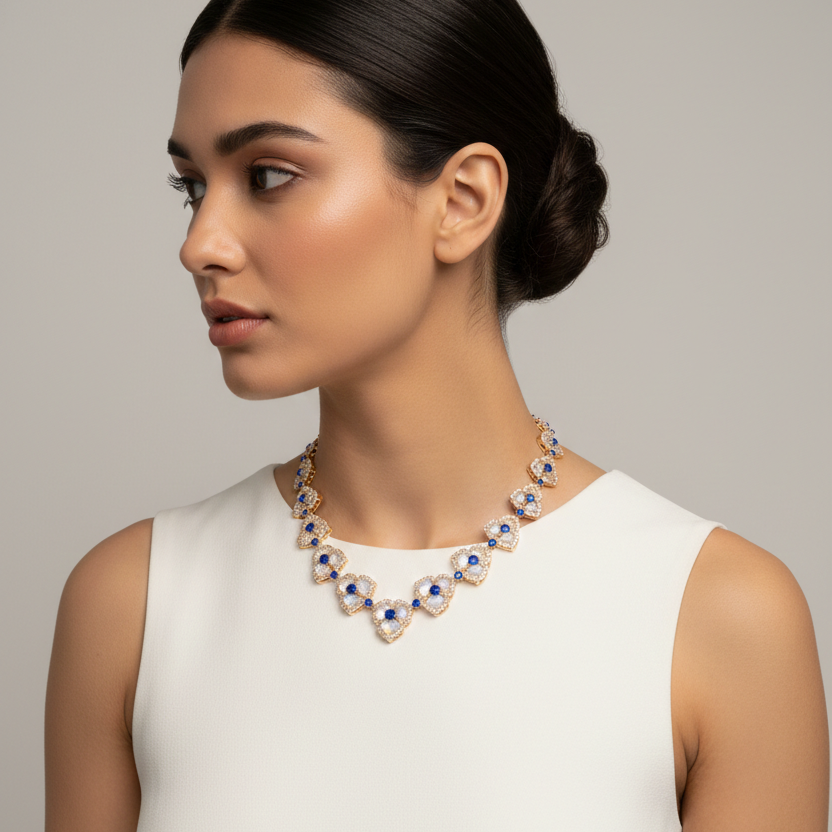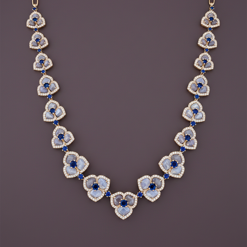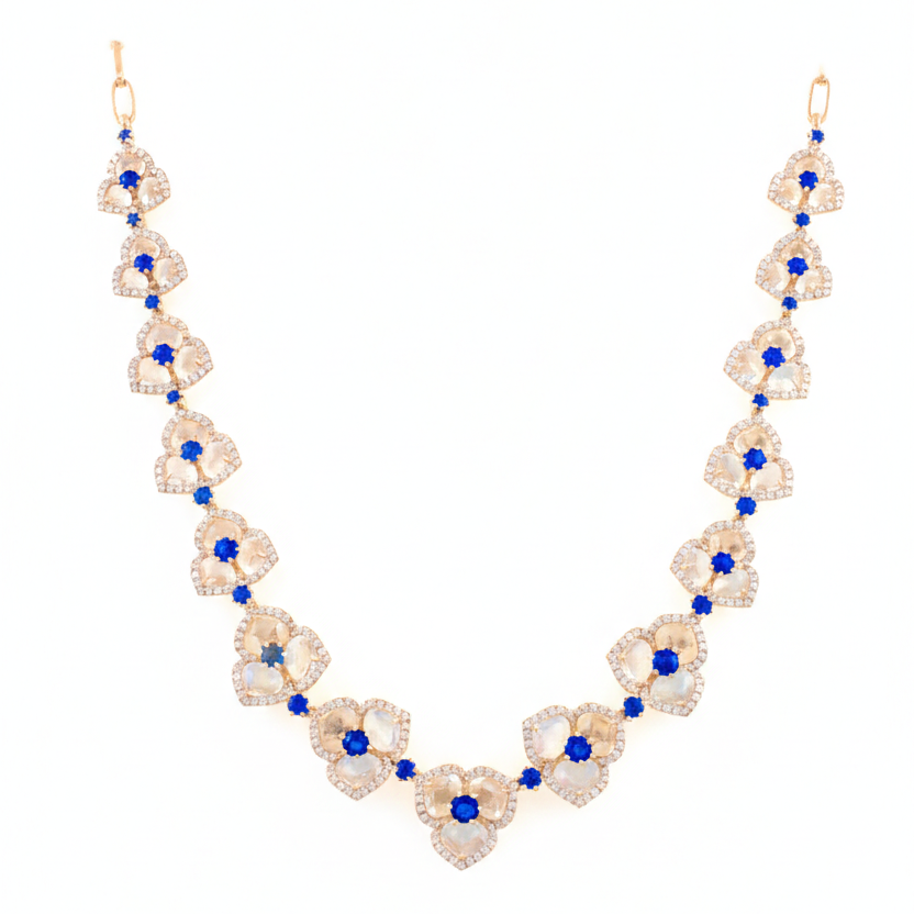 Floral necklace with blue and white stones on a dark background Close-up of Rainbow Moonstone and Blue Sapphire Trillium Necklace with Diamonds