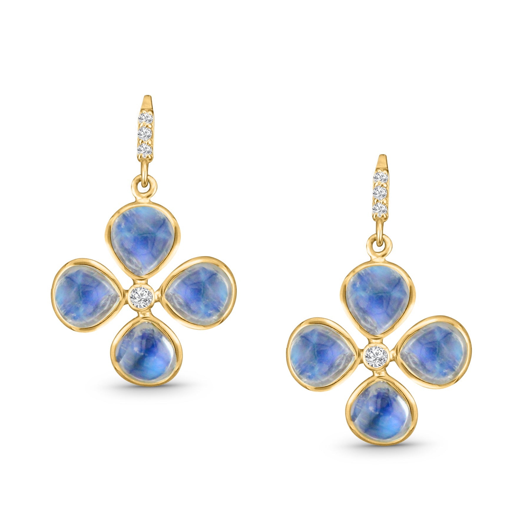 Rainbow Moonstone Tabiz Shape & Diamond Earring In 18K Yellow Gold - Tresor Collection Close-up of blue clover gemstone earrings in gold – elegant handcrafted jewelry
