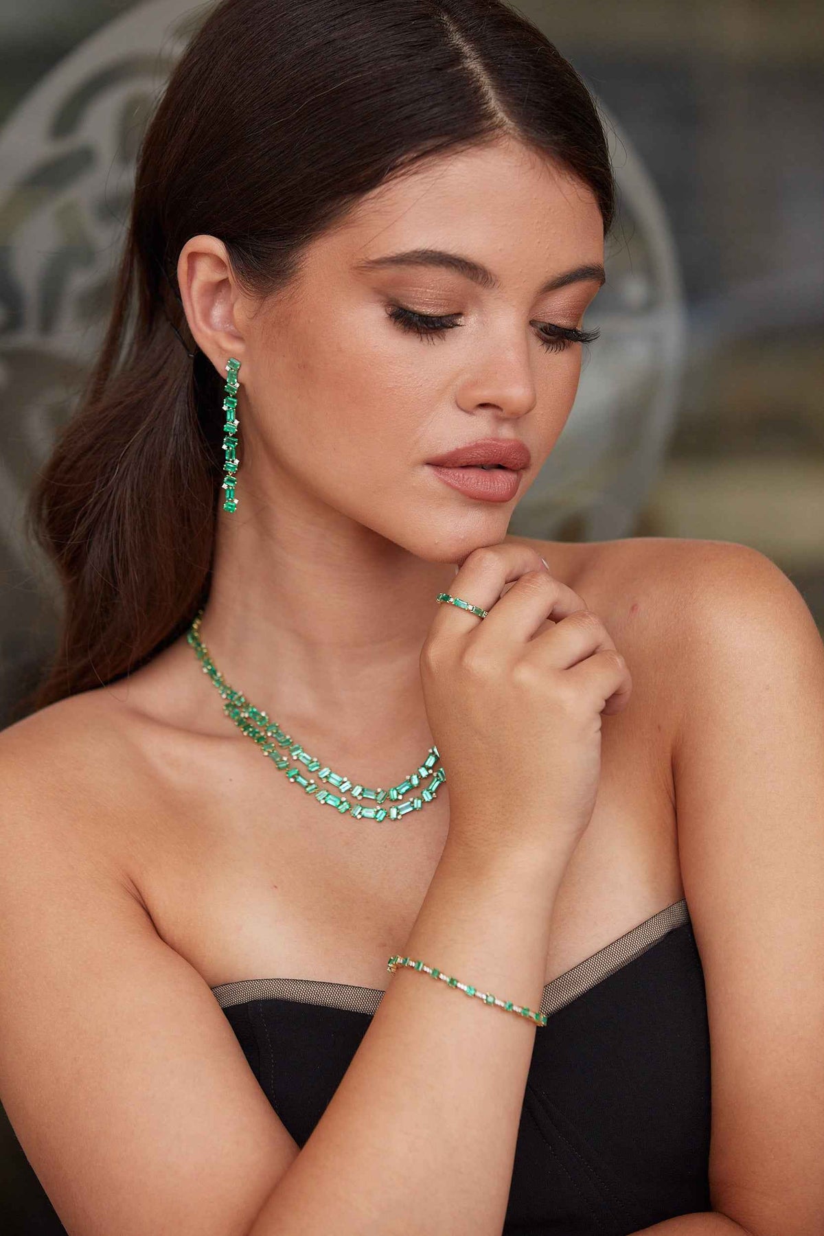 Green emerald bead necklace styled with strapless green dress – sophisticated jewelry by Tresor Collection