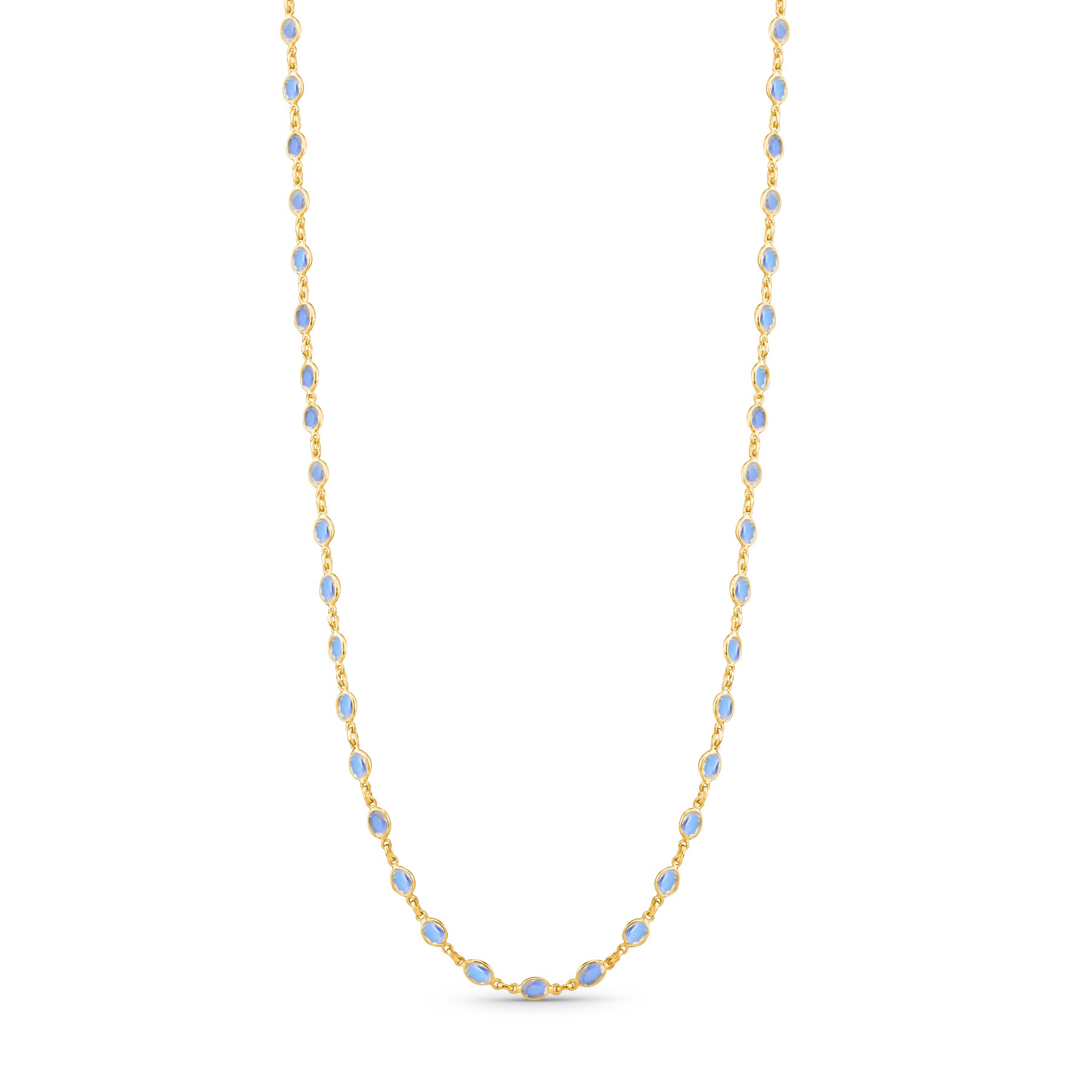 Graceful and luminous, this Rainbow Moonstone Necklace radiates a subtle iridescence that captures light with every movement. Handcrafted in 18K yellow gold, each oval-cut moonstone is meticulously set along a sleek 30-inch chain, reflecting Tresor Collection’s signature balance of elegance and modern minimalism.