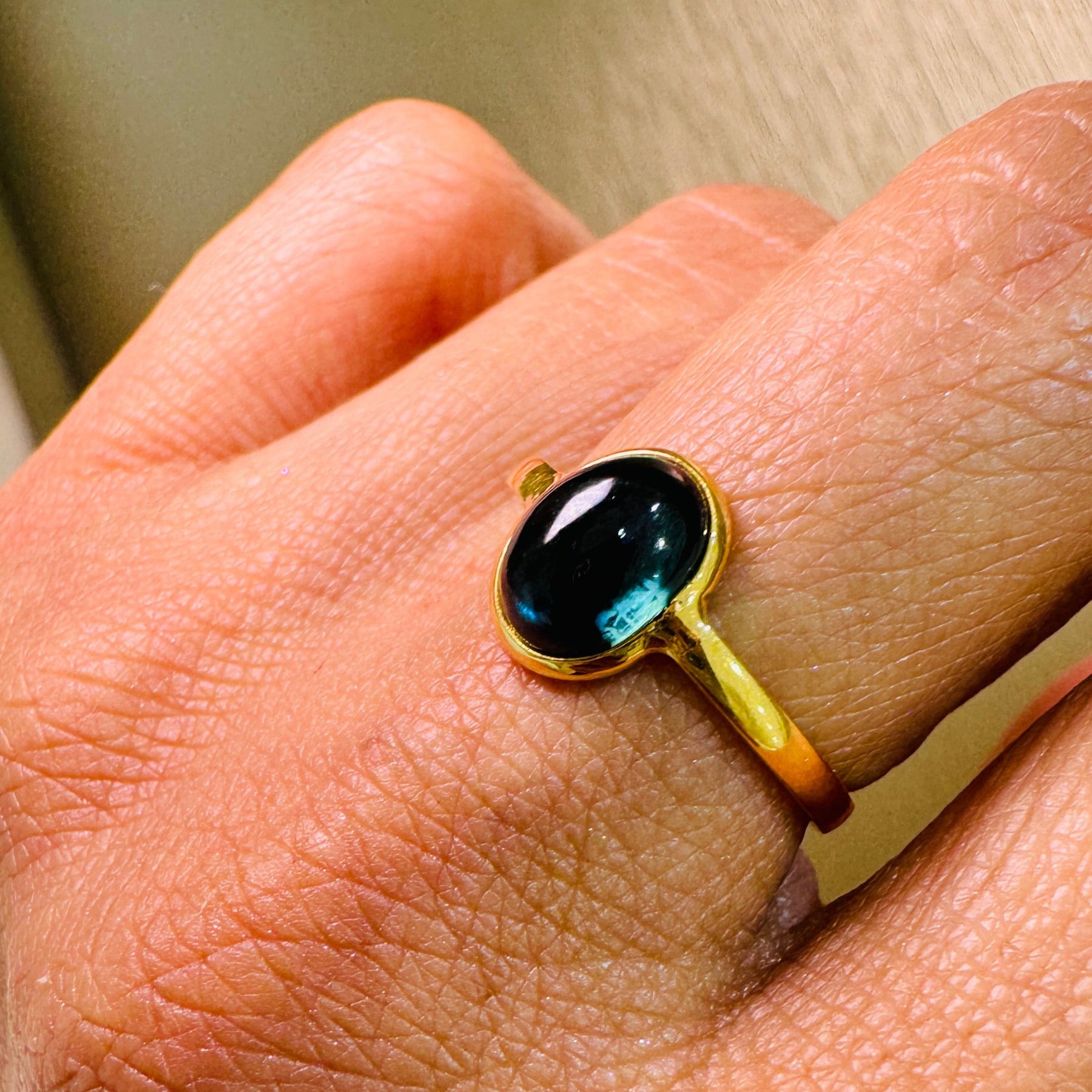 Blue Sapphire Oval Ring In 18K Yellow Gold - Tresor Collection Elegant Blue Sapphire solitaire ring worn on hand – luxury handcrafted gold gemstone jewelry